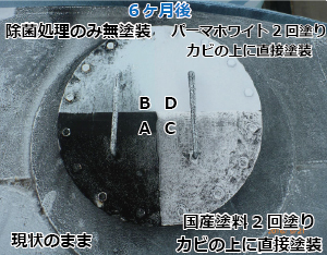 カビ面へ直接塗装するような過酷な実験でも、6ヶ月後にパーマホワイト塗装面(D)にはカビが発生しなかった。パーマホワイトと国産塗料の差は歴然であった。パーマホワイトの防カビ・耐カビ性能の高さが実証された。